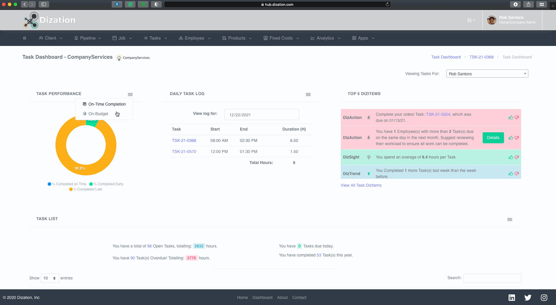 Built-in tools to understand the daily task log for yourself, and your employees to help you stay on top of: