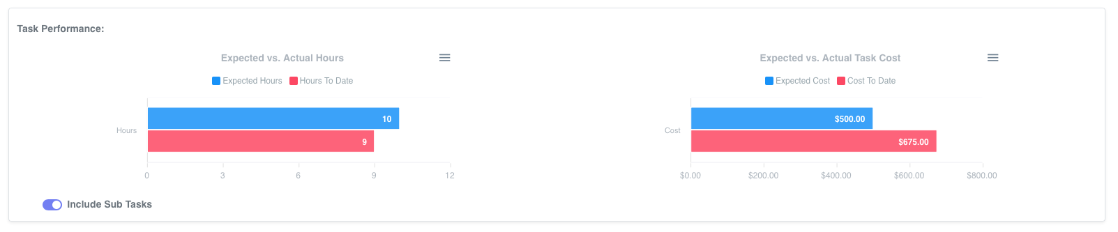 Understand exactly how the task is performing against its expectations. Keep an eye on whether or not your hours, or cost are going above expectations easily.